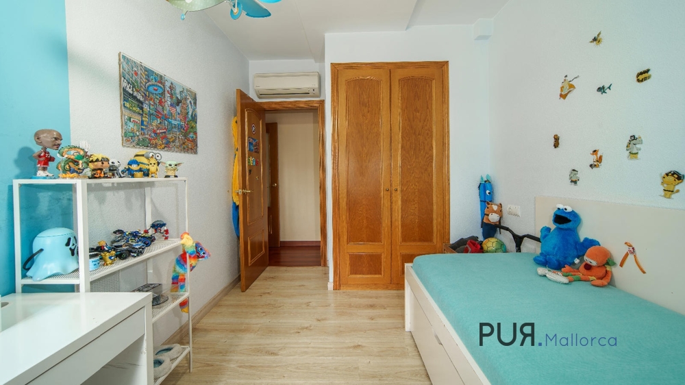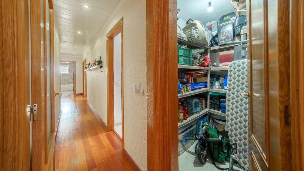 Das Appartement mit ca. 128 m² Wohnfläche verfügt über drei Schlafzimmer, alle mit Einbauschränken, drei Badezimmer – eines davon en-suite –, eine ausgestattete Küche mit Speisekammer und Hauswirtschaftsraum sowie ein Wohn-Esszimmer mit Zugang zur Terrasse mit Blick auf die den Pool.