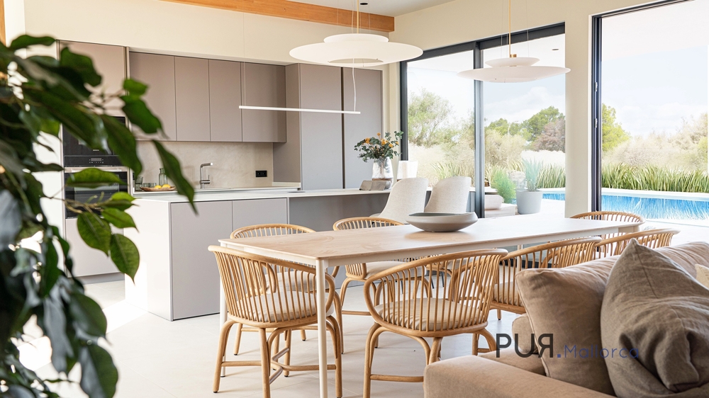 Das Haus ist hochwertig ausgestattet, mit einer Designerküche von Cocinart und Geräten von Siemens, Miele und Bora. Fußbodenheizung, integrierte Klimaanlage und Decton-Böden.