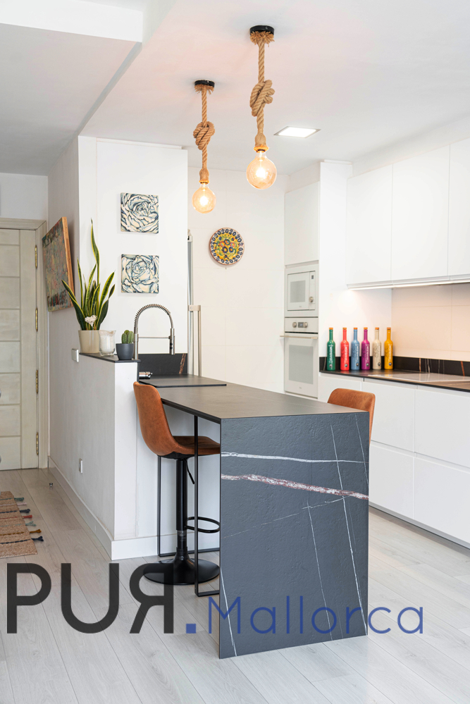 Das Appartement bietet eine Fläche von ca. 94 m² über zwei Etagen. Im Erdgeschoss gibt es einen offenen Grundriss mit Wohnzimmer, Küche, Essbereich, Gäste-WC und einen kleinen Balkon.
