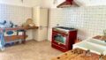 Die offen gestaltete Wohnküche mit Kamin bietet Zugang zum Außenbereich mit Veranda, Terrasse, Pool und Abstellraum.